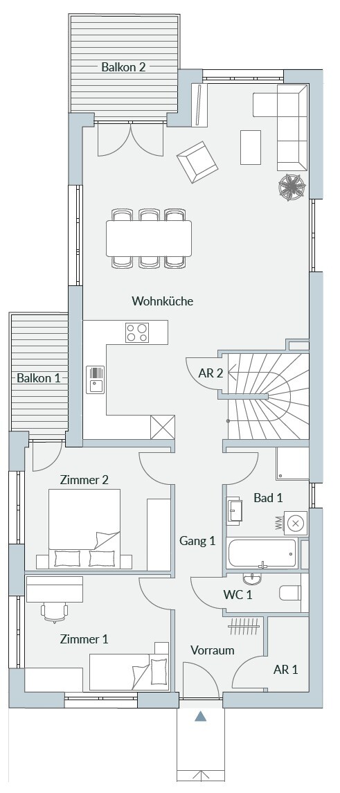 Die Maisonetten überzeugen mit klarer Raumaufteilung, lichtdurchfluteten Wohnbereichen, 3–4 Schlafzimmern und großzügigen Terrassen bzw. Balkonen.